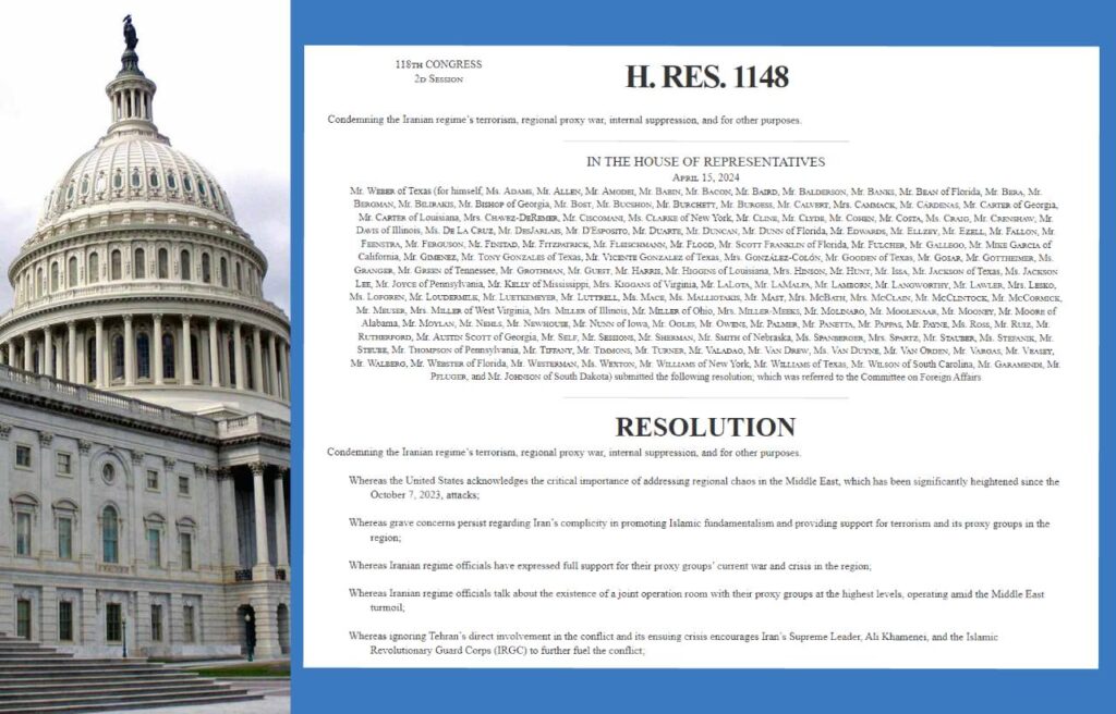House Resolution 1148, introduced on April 16 in the United States House of Representatives, marks a significant bipartisan effort with 145 co-sponsors. This resolution serves as a robust denouncement of the Iranian regime’s diverse transgressions, encompassing terrorism, regional conflict escalation through proxy warfare, internal repression, and support for the Iranian Resistance, including Mrs. Maryam Rajavi’s Ten-Point Plan endorsed by the President-elect of the National Council of Resistance of Iran.